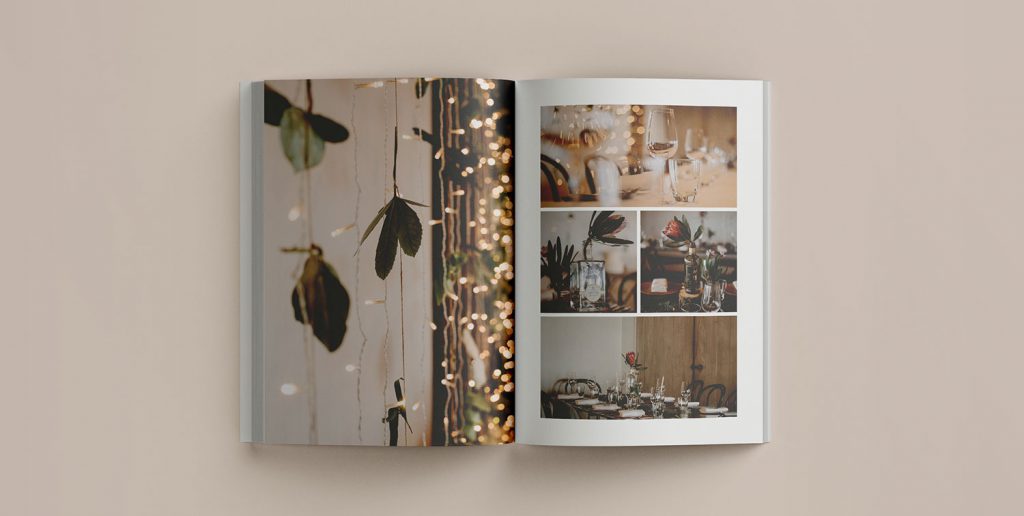 Your magazine style wedding album will be A4 portrait size (210 x 297mm), comes perfect bound and will have 180 pages. These pages will include up to 300 images. We’ve found this is just the right amount to showcase your full wedding day; bride and groom getting ready, the ceremony, bridal party, the perfect golden hour shots, the reception and even husband and wife cutting some shapes on the dance floor.